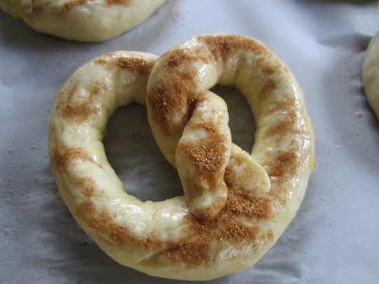 then place onto prepared baking sheets. Brush each pretzel with the egg yolk and sprinkle with kosher salt.
