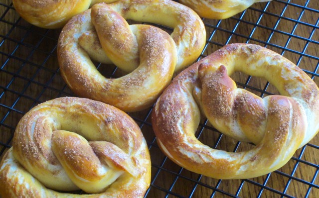 6. Bring the  5-cups water to a rolling boil and add the baking soda to the water. Reduce to a simmer and dip each pretzel into the baking soda solution for 30 seconds (do not leave longer). Using a slotted spatula, lift the pretzel out of the water and allow as much excess water to drip off then place onto prepared baking sheets. Brush each pretzel with the egg yolk and sprinkle with kosher salt. You can also sprinkle with cinnamon sugar. Bake in the preheated oven until golden, about 12-14 minutes.