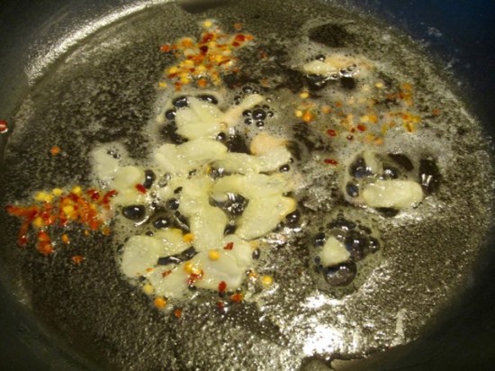 Melt the butter. Sauté the garlic and red pepper flakes over low heat for 1-2 minutes, without turning brown.