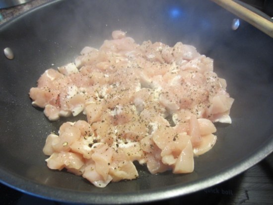 Heat the olive oil in a large pot or skillet over high heat and stir fry the chicken
