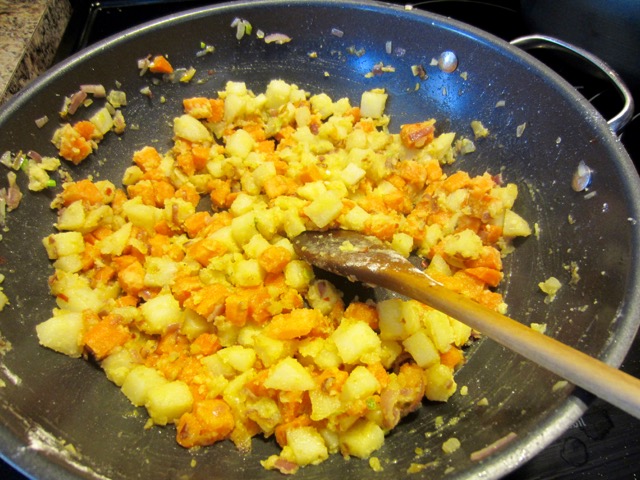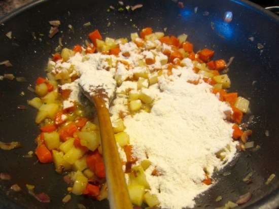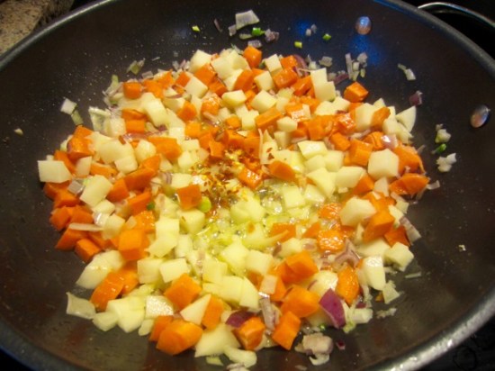 Add the onion, carrots potatoes and chilli flakes and cook until softened about 8 minutes. Add the garlic and cook until fragrant, 30 seconds.