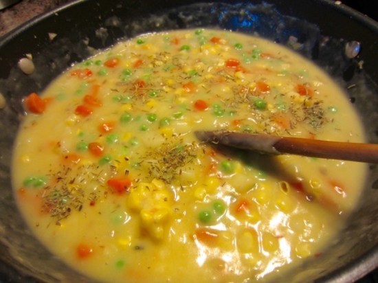- Make the filling: In the same pot, melt the butter over medium-high heat. Add the onion, carrots, potatoes and chilli flakes and cook until softened about 8 minutes. Add the garlic and cook until fragrant, 30 seconds. Add the flour and stir to coat the vegetables. Slowly add the broth, whisking constantly until the sauce is smooth. Bring the sauce to the boil, reduce the heat, and simmer until thickened, 5 to 7 minutes. Stir in the peas, corn, rosemary and thyme, then stir in chicken. Check seasoning and adjust salt and pepper if necessary. Pour filling into a 2-quart baking dish. Stir in the Parmesan.
