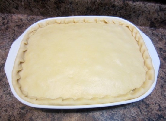 - Roll out dough to 1/8-inch thickness on a lightly floured surface. Place the dough over dish and fold the extra inward while pinching to crimp edge. Make slits on the dough.