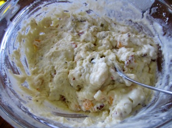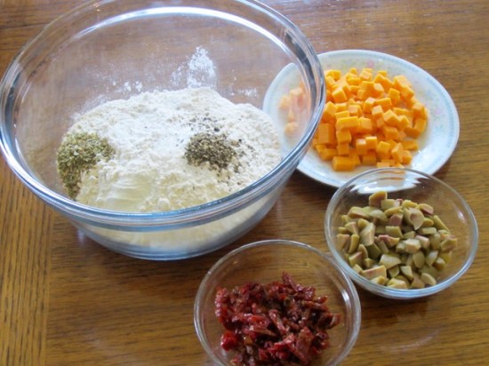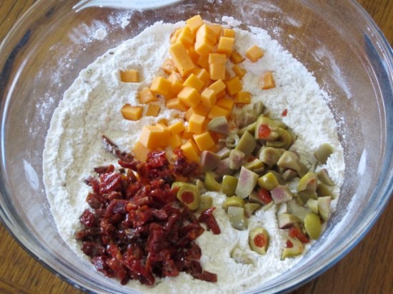 Stir in the cheddar, sun-dried tomatoes and olives into the flour. Make a well in the centre.