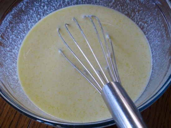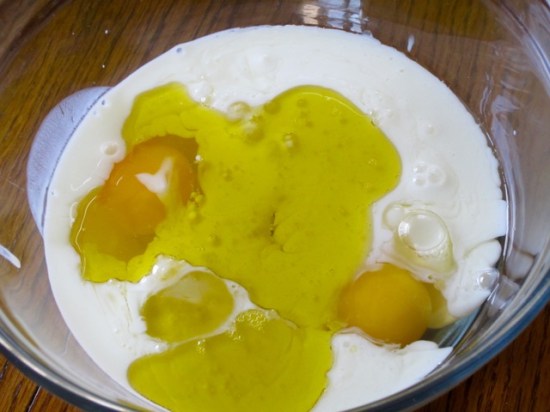 - In a separate bowl, whisk together the eggs, olive oil and buttermilk.