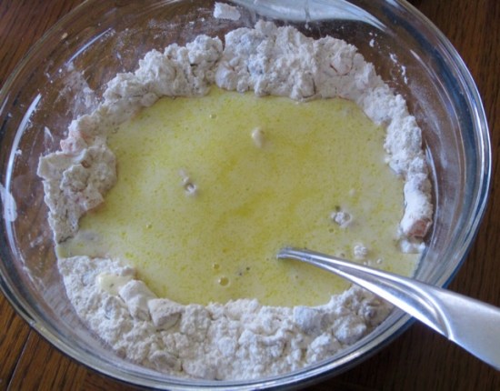 - Pour the egg-buttermilk mixture into the well. Mix gently with a wooden spoon until all the ingredients are well combined. (The dough will be sticky.)