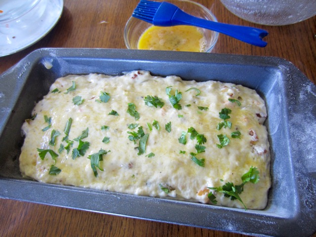 Transfer the dough into the prepared bread pan and spread it evenly. Brush with the egg wash if you like and garnish with chopped cilantro or parsley.