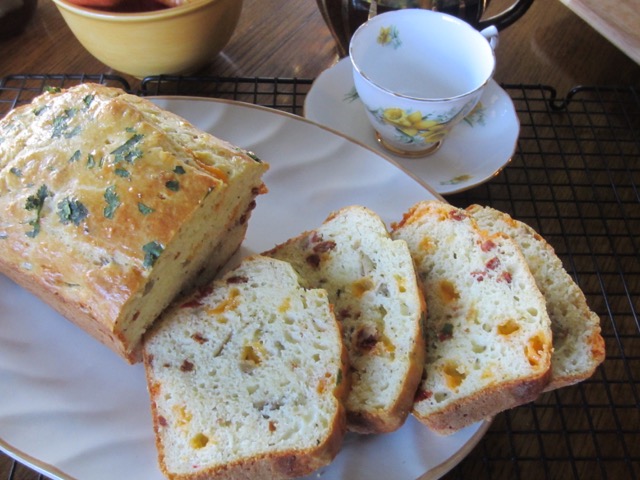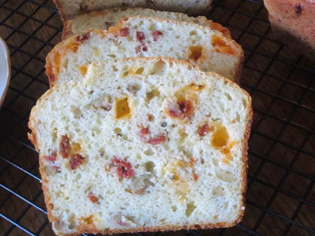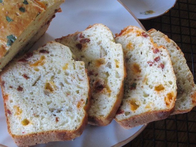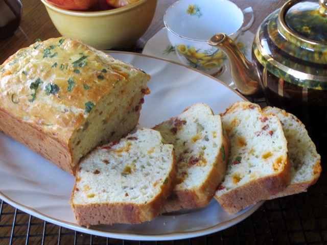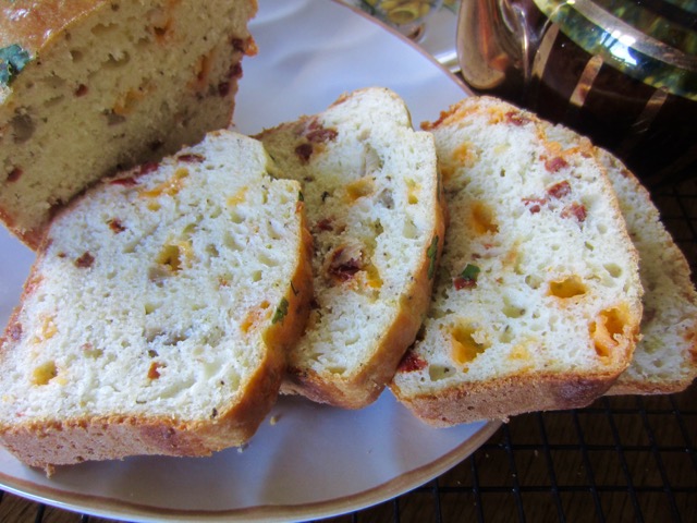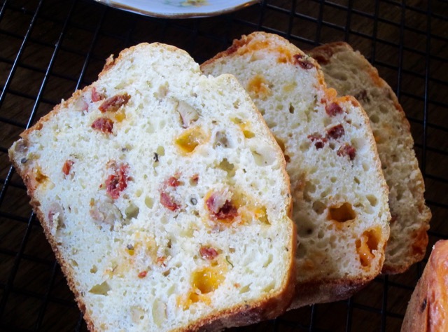 I have just finished the last of this bread right now, with my cup of Orange Pekoe Tea. It tasted good. The main ingredients are sun-dried tomato, olives and cheddar cheese. You can use any combination of savoury ingredients that you like. I wish you a pleasant weekend!