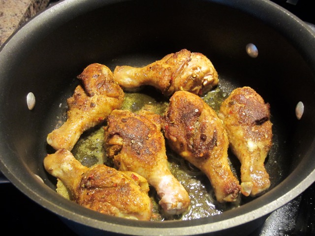 Heat 2 tablespoons oil in a large heavy based or cast-iron skillet over medium heat. Brown the chicken on all sides.Reduce the heat to medium-low, cover the skillet with a lid and let the drumsticks fry gently for 20-25 minutes turning them regularly.