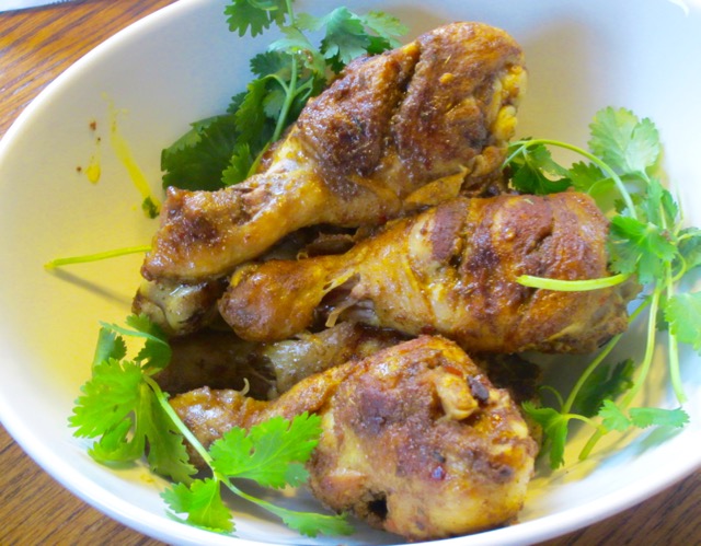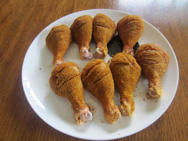 1. Combine all the spices in a small bowl. Make 2-3 slits on each drumstick. Using your hands, generously rub the spice mix all over the chicken pieces and into the slits and under the skin.