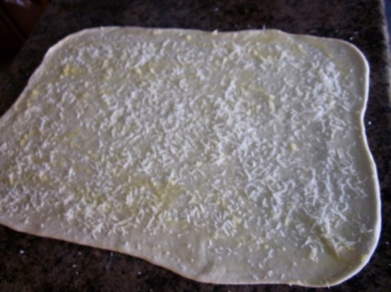 6. Brush the rolled out dough with 2/3 the garlic butter. Sprinkle with Parmesan cheese, oregano and give a good grinding of pepper. (don’t use too much butter)