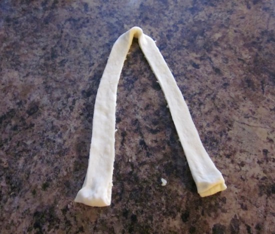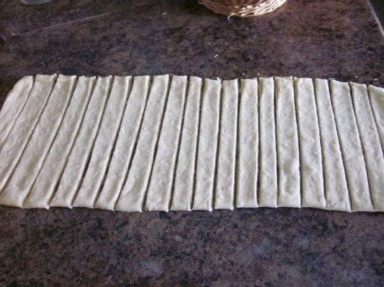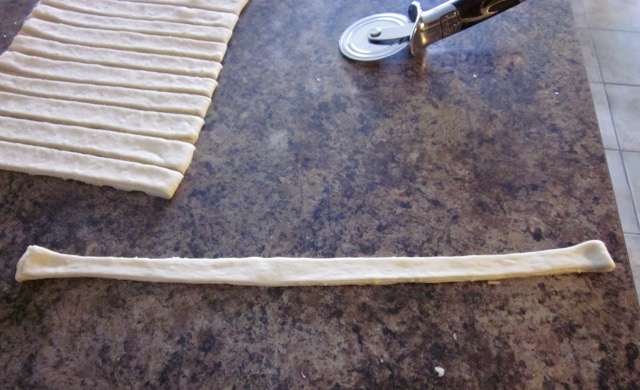 Fold the oblong in half lengthwise and press carefully to ensure the two sides stick together, then cut into ¾ inch strips. using a pizza wheel or sharp knife.
