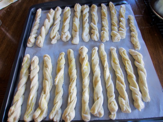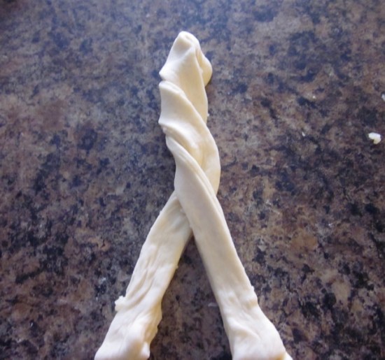 8. Take one strip and extend it to about 16 inches then make a fold in the middle.Twist the two sides and place on prepared baking sheet. Repeat this step for the rest of the strips.