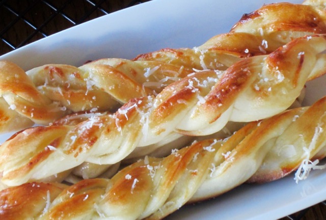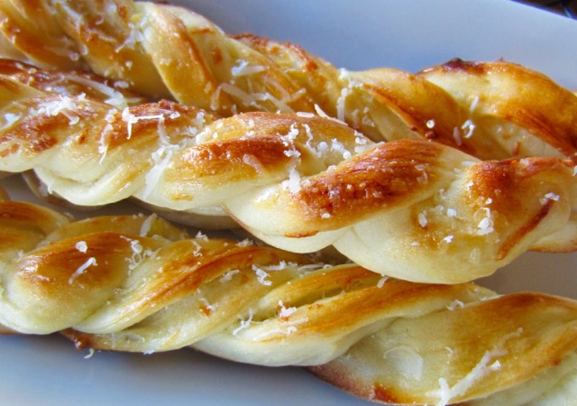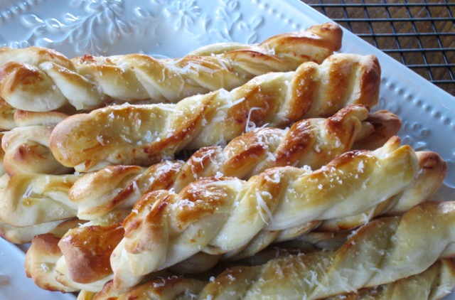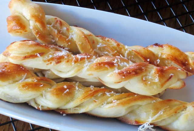 Remove from the oven and brush the hot breadsticks with remaining garlic butter and sprinkle with Parmesan and coarse salt.