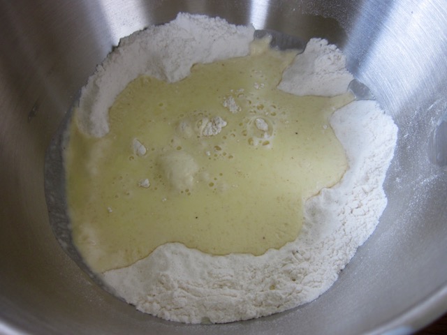 2. In another bowl, whisk together the water, milk and egg. Add the water-milk mixture and butter or margarine to the flour. Using the dough hook attachment mix until it forms into a ball. Knead for five minutes .(The dough should be firm and a bit sticky at this point)