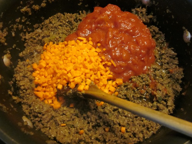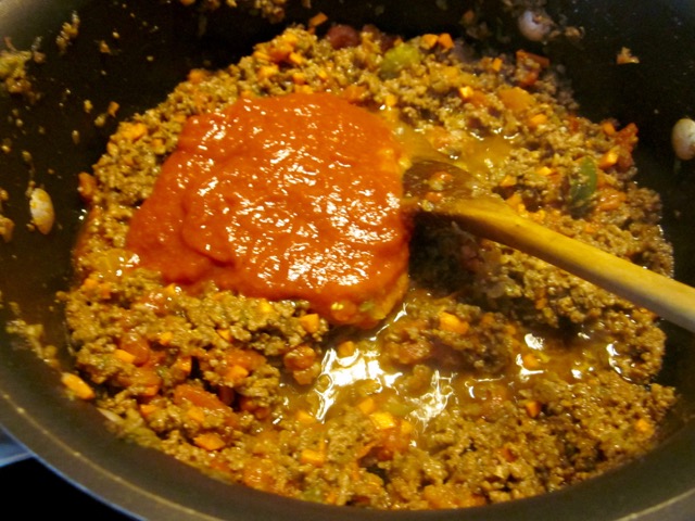 Add the beef, increase the heat and cook stirring continuously until no longer pink and most of the water has evaporated.