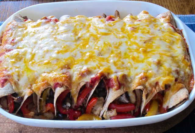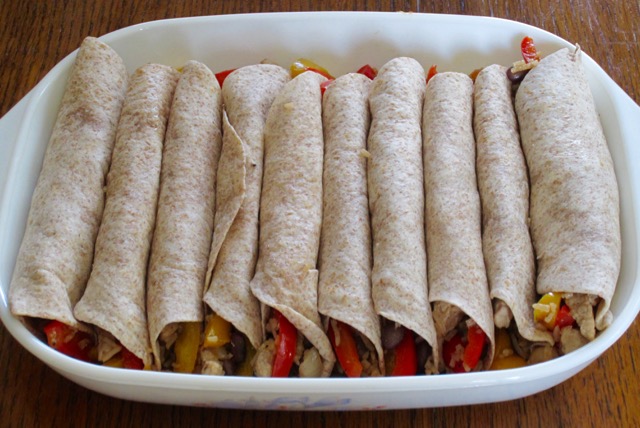 Spoon the filling evenly over the 8 tortillas, roll them up and arrange them in a 10 x 9 oven dish.