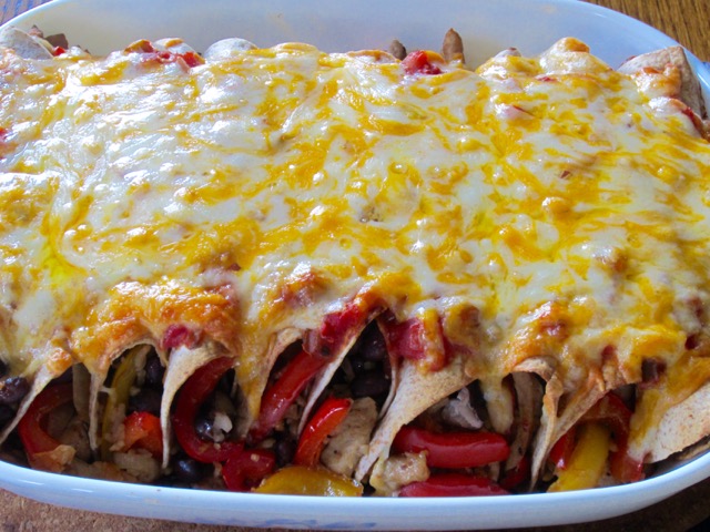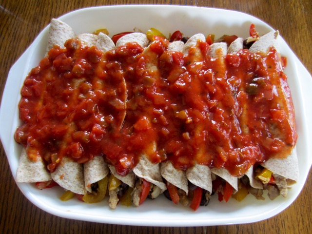 - Spoon the filling evenly over the 8 tortillas, roll them up and arrange them in a XXX oven dish. Spoon the salsa over the tortillas and top with the cheese. Bake about 20 minutes until hot and cheese is melted. Serve immediately with guacamole or tomato salsa.