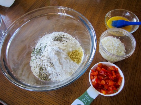 - In a large bowl, sift or whisk together the flour, baking powder, baking soda, salt, black pepper, mustard powder, thyme and rosemary until well combined. Stir in the Parmesan and roasted pepper into the flour. Make a well in the centre.