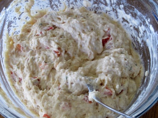 Stir in the Parmesan and roasted pepper into the flour. Make a well in the centre.