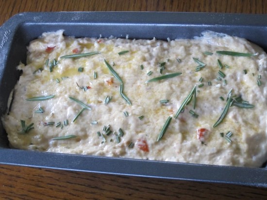 Transfer the dough into the prepared bread pan and spread it evenly. Brush with the egg wash if you like and garnish with rosemary leaves.