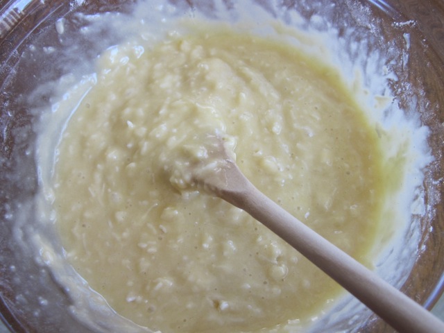 - Add the egg-coconut milk mixture into the well and stir until combined. Fold in the grated carrot and currants..