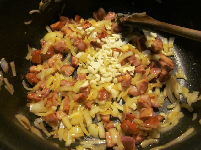 Add the onions to the chorizo and stir and let them soak up the chorizo flavour.