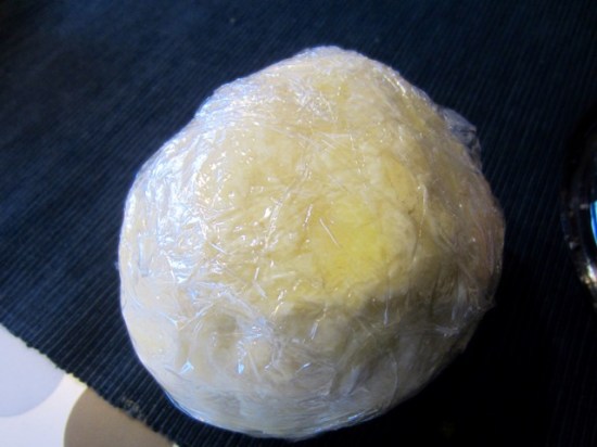 2. When the cubes of the butter have become small pieces and the dough is grizzly, gradually add the iced water and mix until it is all incorporated, but don’t overwork the dough. Shape the dough into a ball, wrap in a cling film and chill 20 minutes.