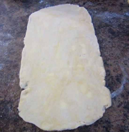 Flour the counter and roll out the dough into a 16 x 8 inch (40 x 20cm) rectangle.