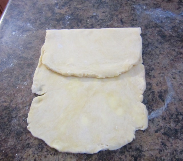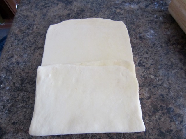 Roll the dough into a 16 x 8 inch (40 x 20cm) rectangle, for the second time. Brush off any excess flour and fold it into three like a book and give it a quarter turn. These are the first two turns.