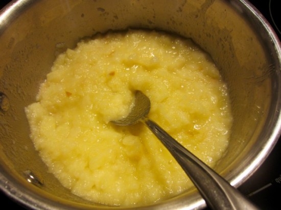 To make the apple puree: Put the McIntosh apples into a small pan. Add the water, vanilla bean butter and sugar to the apples in the pan and cook until tender. Take off the heat, discard the vanilla bean, and using a wooden spoon smash the apples into a puree.