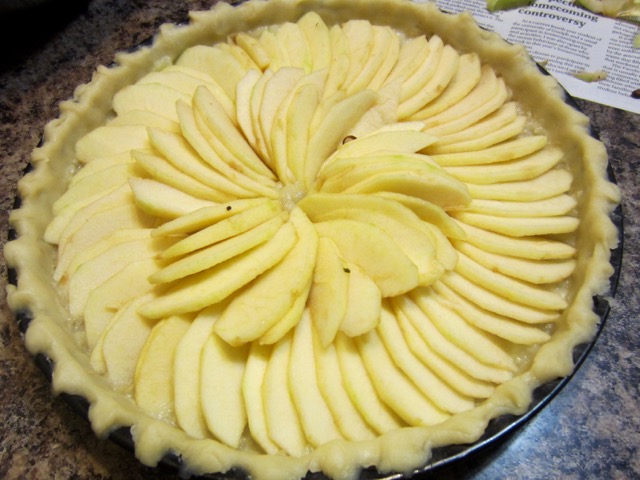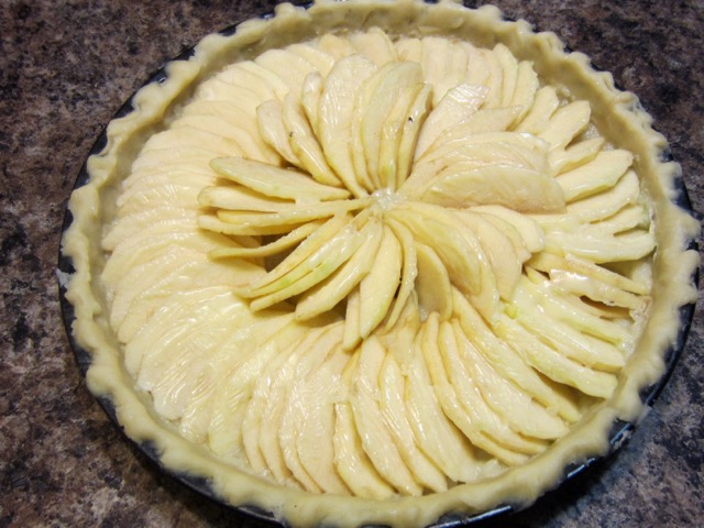 Arrange a border of overlapping apple slices around the tart, then arrange another circle inside with the slices facing the other direction. Fill the centre with a little rosette of small slices, trimming to fit as necessary.