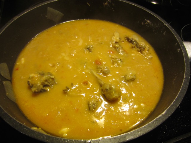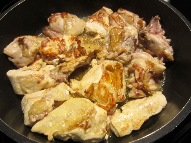 Add the chicken pieces and chopped carcass and brown them lightly over medium heat.