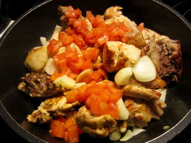 - Add the onions, tomatoes and bouquet garni. Season with salt and cook for a few minutes. Add the wine, cover the pan with a lid and simmer gently for 15 minutes. Add the carrots in the last 5 minutes of cooking. Remove the chicken pieces and carrots from the pan. Cut the chicken into cubes then set side, with the carrots, covered with a damp dish towel.
