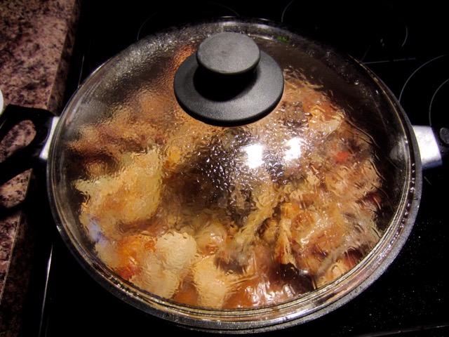 Add the wine, cover the pan with a lid and simmer gently for 15 minutes. Add the carrots in the last 10 minutes of cooking. Remove the chicken pieces and carrots from the pan and set side covered with a damp dish towel. Slice the chicken into bite size pieces.