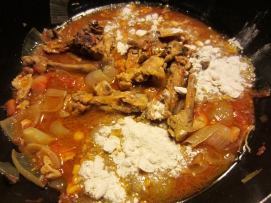 - Sprinkle the toasted flour into the skillet and stir continuously until blended. Add the chicken stock, bring to the boil, stirring from time to time, then cook for 20 minutes, skimming the surface from time to time.