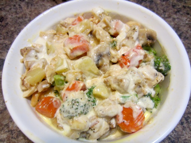 - Strain the chicken sauce over the chicken and carrot pieces. Add the pork cubes, mushrooms, and broccoli and mix delicately with a wooden spoon. Season with salt and pepper to taste. Divide the chicken, sauce and veggies between the 4 pie dishes. Leave at room temperature until cold then chill for 1 hour.