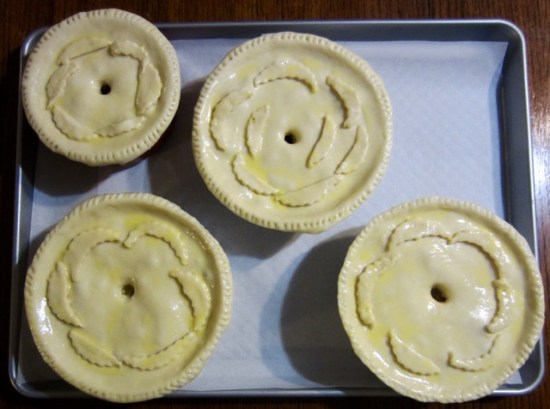 Assembling the pies: on a floured surface, roll one quarter of the dough into a 6½ inch (16cm) circle, 1/8-inch (3mm) thick. Brush the top edge of one pie dish with egg wash and cover with the dough. Repeat with the other three pies and chill the pies for 20 minutes.