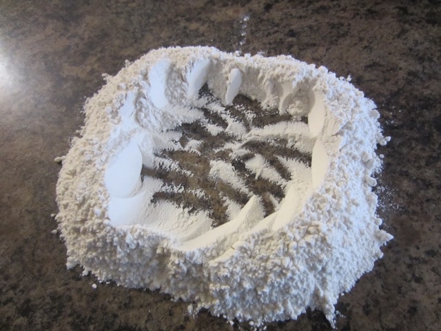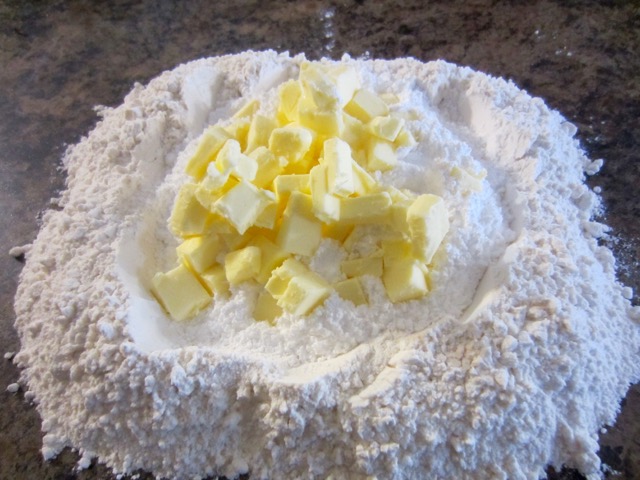 - Heap the flour onto the counter and make a well in the centre. Put the butter, sugar, and salt into the well. Mix the butter sugar and salt with your fingertips.