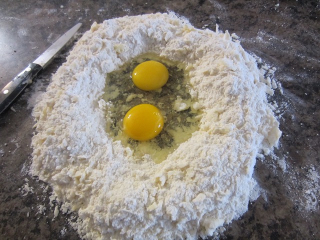 Again, make a well in the centre and add the eggs. Work them into the flour mixture using your fingertips