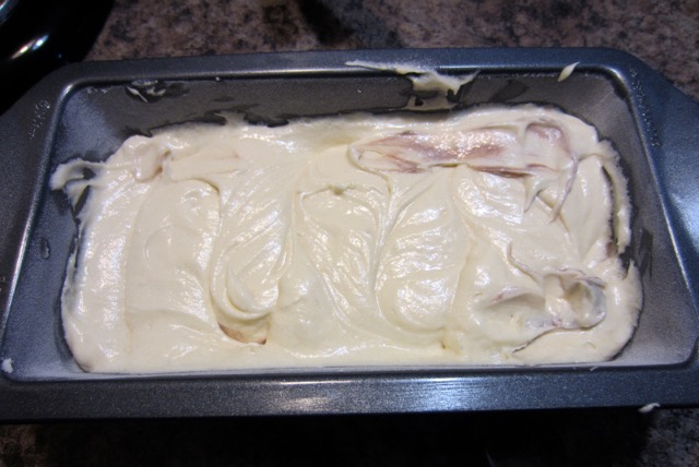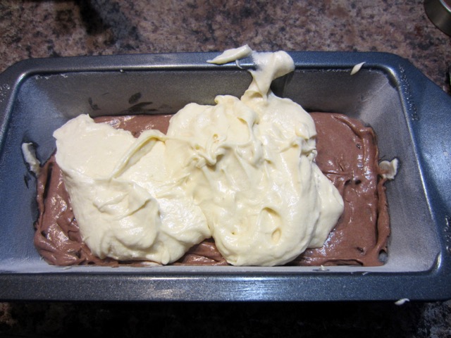Then spoon and spread the chocolate chip batter on top. Top and spread with the remaining batter. (I had just cooked lunch and a loaf of bread for afternoon tea so I was rather tired and splashing the batter all over the place ha ha!)