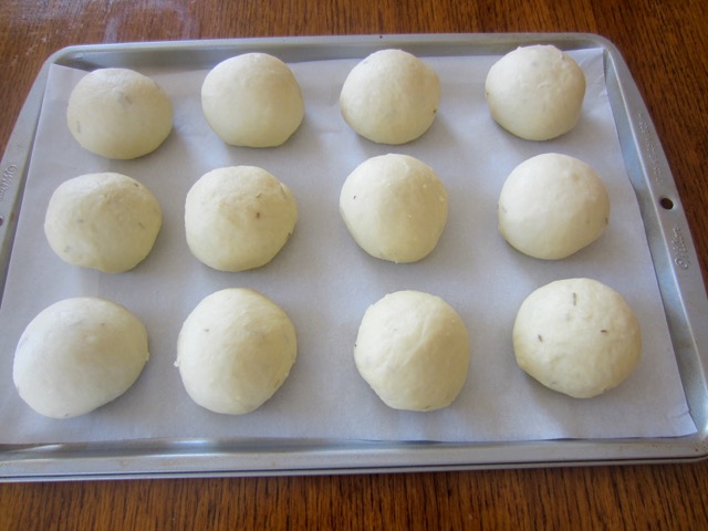 4. Gently deflate the dough and divide into 12 equal pieces. Form into balls. Arrange on the prepared baking sheet, cover and let rise about 50 minutes or until doubled in size.