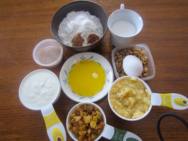 Whisk or sift the flour, baking powder, salt, nutmeg and cinnamon. Make a well in the centre. In another bowl whisk together the sugar, egg, bananas, yoghurt and butter until well blended.