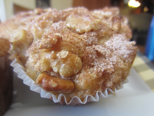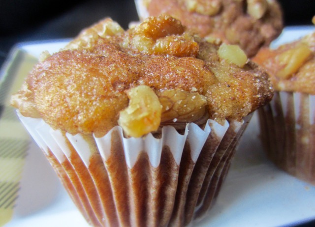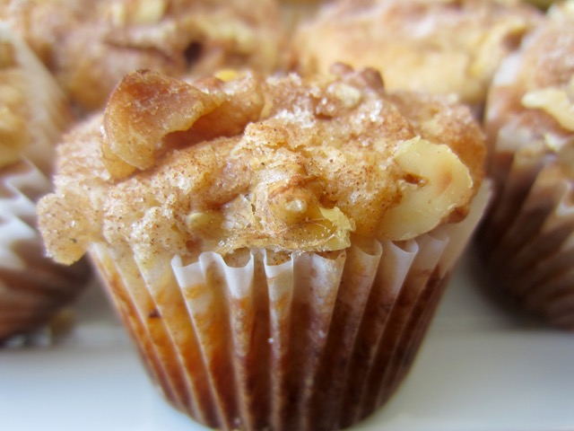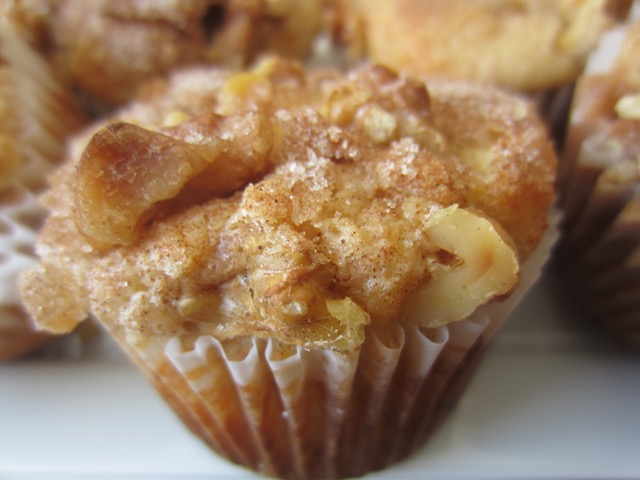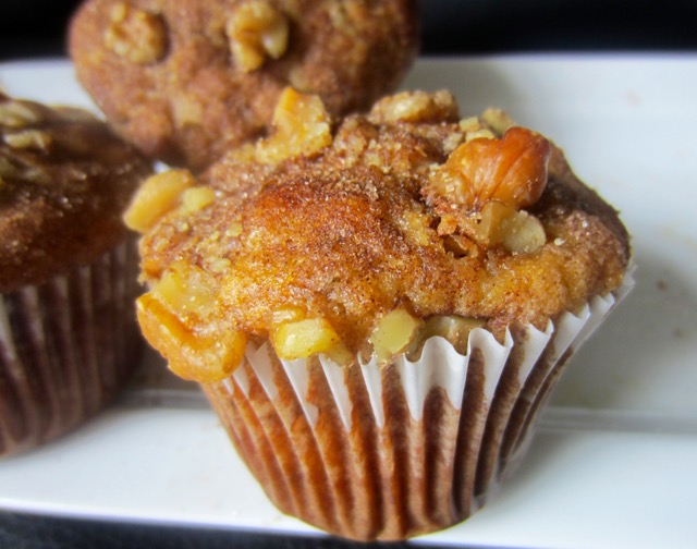 Spoon the batter into the prepared muffin cases. Sprinkle with cinnamon sugar and walnuts. Bake 23-25 minutes until tops are golden and a toothpick inserted in the centre comes out clean.