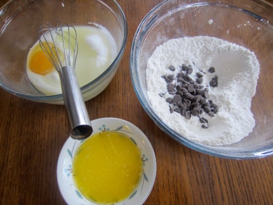 2. Sift flour, baking powder and baking soda (bicarbonate of soda into a bowl. Stop in the chocolate chips. Make a well in the centre.