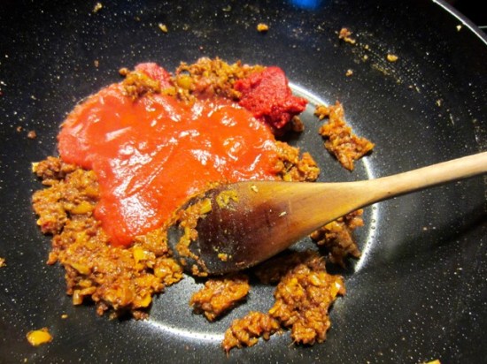 Add the strained tomatoes and bouillon cube and cook another minute,