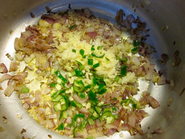 Add the chopped onions and cook until golden brown, then add the ginger, garlic (or ginger-garlic paste) and green chilli and cook briefly. Please do not omit the chilli-it gives a lovely kick to the dish.