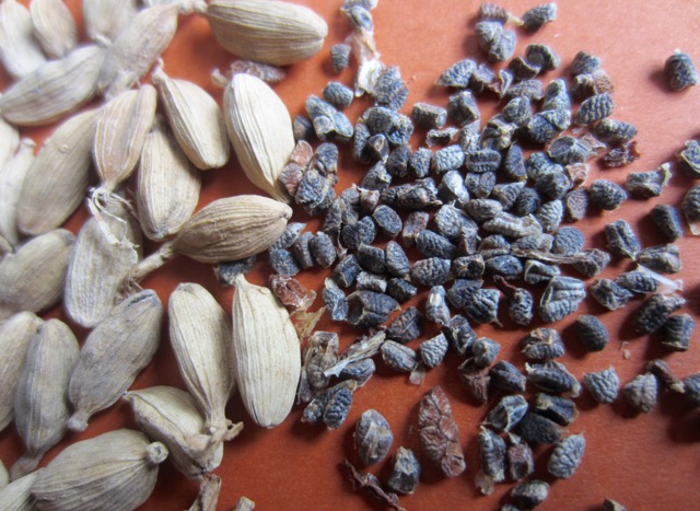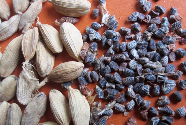 Each cardamom fruit (pod) contains 15-20 small black seeds which are used as a spice, in whole or ground form. The black seeds are ground into cardamom powder. Pure ground cardamom can be bought in stores.