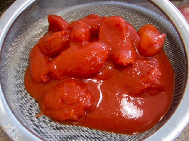 - Drain the tomatoes thoroughly in a colander or strainer with fine mesh, to remove all the liquid. Crush the tomatoes lightly to remove any trapped liquid inside and drain again, thoroughly.