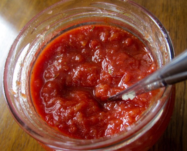 2. Coarsely blend the tomatoes in a blender and stir in salt. Store in a tightly covered container in the fridge for up to one week. (you can add herbs, or pepper if you want). Mine is usually quite spicy….ahem.